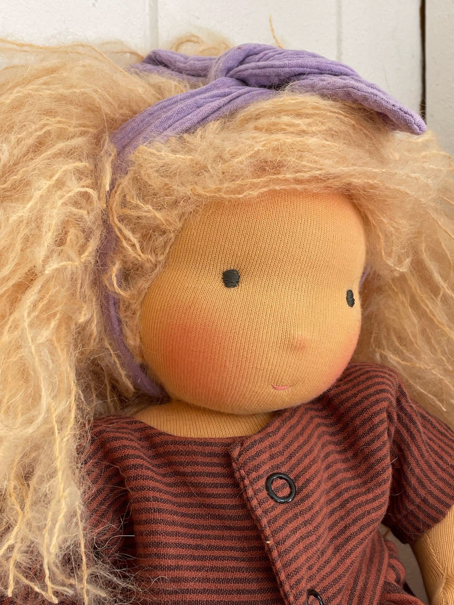 Sie ist eine große Puppe (40cm) und hat warme, dunkelgrüne Augen und sonnengelbe, lange Haare. Rika trägt ein Kleid aus Musselin in Brauntönen und eine hellrosa Leinenhose.